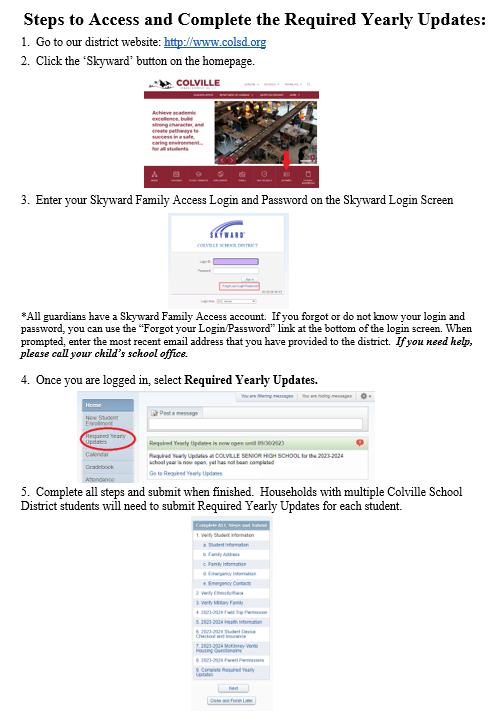 The Colville School District uses an online format to collect important information for students each school year. This is a yearly-required process for guardians. We recommend that guardians use a laptop, desktop, or chrome book computer to complete the Required Yearly Updates, however any internet connected device will work. Guardians may use their student’s school issued device for this purpose.